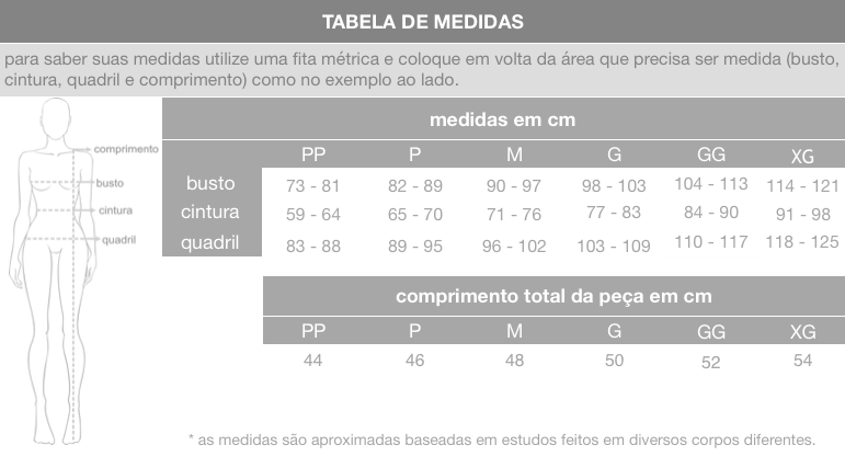 então depois de alguns estudos feitos por mim (Mirnna), criamos a tabela de medidas abaixo que de acordo com o tamanho do seu corpo você consegue encontrar o seu tamanho na nossa marca.
