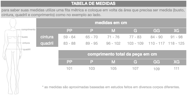 * selecionando a opção de alteração de comprimento o pedido será feito na medida enviada pela cliente (da cintura até o pé) no campo de anotações no momento do pagamento do pedido. se a opção não for selecionada a alteração não poderá ser feita!