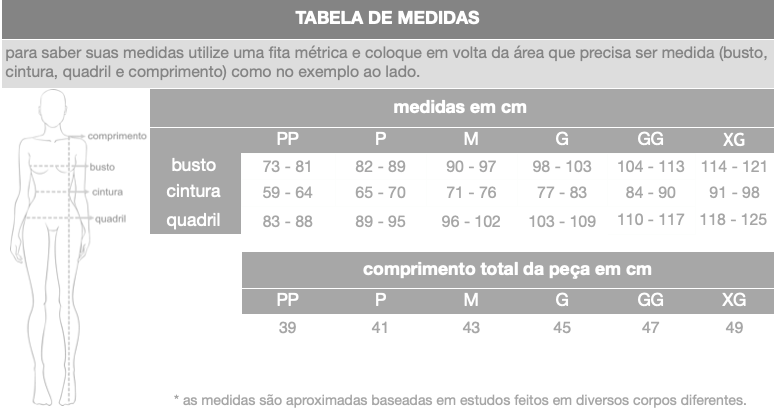 então depois de alguns estudos feitos por mim (Mirnna), criamos a tabela de medidas abaixo que de acordo com o tamanho do seu corpo você consegue encontrar o seu tamanho na nossa marca.