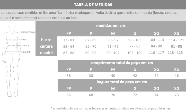 então depois de alguns estudos feitos por mim (Mirnna), criamos a tabela de medidas abaixo que de acordo com o tamanho do seu corpo você consegue encontrar o seu tamanho na nossa marca.